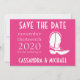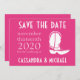 Anúncios de Salve a Data de Bota de Cowboy (Rosa Escuro Quente / Branco)...Esses anúncios de salve a data de bota de cowboy ou cowgirl são a maneira perfeita de pedir aos amigos e familiares para salvar a data para o seu próximo casamento. Perfeito para a noiva e o noivo que estão tendo uma recepção de casamento country western ou tema cowboy. O design apresenta uma bota de cowboy divertida. Perfeito para o casal que vai se casar em uma fazenda ou rancho ou a cavalo! Ótimo para casamentos de destino. Veja WindyCityStationery.com para nossa linha completa de anúncios de "Bota de Cowboy" em uma ampla gama de cores, bem como selos postais "Bota de Cowboy", cartões de agradecimento, etiquetas de endereço de devolução, ímãs de salve a data e muito mais.