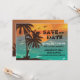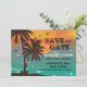 Um belo design tropical com águas turquesa e um grande pôr do sol. Envie um anúncio de "Salve a Data" com um cartão atraente.