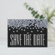 Um simples, mas lindo cartão de anúncio de salve a data de casamento moderno em preto e branco com acentos azuis. No topo do cartão estão faíscas de brilho com efeito de diamante falso.