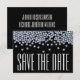 Um simples, porém belo cartão de anúncio de save the date de casamento moderno em preto e branco com sotaques azuis. No topo do cartão estão faíscas de brilho com efeito de diamante falso.