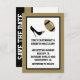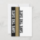 Anúncio divertido de casamento de futebol para Save the Date feito com uma moldura bege e preta em torno de uma área de texto branca. Gráficos de um salto alto de stiletto chutando uma bola de futebol bege e preta decoram a parte superior do cartão, com texto preto, abaixo. A parte de trás é feita em listras verticais pretas, bege e brancas com Save The Date em letras negrito na vertical. Personalize todo o texto para atender às suas necessidades. Ótimos anúncios de Save The Date para o casal fã de futebol.