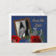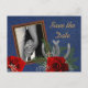 Divertido e sofisticado ao mesmo tempo, este cartão postal de anúncio de "save the date" com visual western em jeans permite que você personalize-o ao enviar sua própria foto, alterar o tamanho e a posição dos gráficos e alterar o texto em ambos os lados. O texto "Save the Date" é formatado em três camadas para dar um visual de sobreposição dourada. Acompanhado de rosas vermelhas, gipsófilas e ferraduras prateadas. Da coleção Western Wedding em www.zazzle.com/RanchLady*
