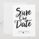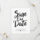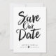 Este design apresenta as palavras "save the date" em negrito e letra manuscrita preta. Os nomes do casal e os detalhes do casamento são exibidos abaixo e podem ser personalizados.