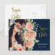 Cartão postal de anúncio de Save the Date floral em azul marinho e dourado