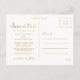 Magnífica tipografia de brilho dourado falso na frente deste cartão postal de designer que você pode carregar com sua própria foto de retrato de noivado/salve a data. Personalize fácil e rapidamente este cartão postal de salve a data impresso profissionalmente aqui e agora, apenas digitando sobre o texto de exemplo e adicionando sua própria fotografia. Tipografia elegante, chique, simples e sofisticada de letras douradas brilhantes