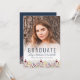 Uma bela borda floral de aquarela de flores silvestres decora a borda inferior deste cartão de anúncio de graduação de bolho de tendência. Na frente da placa, personalize a cobertura de texto azul do marinho em uma foto vertical do formando, com o nome do formando em script de escrita manual e o ano escolar e de classe em fonte sans serif. A parte de trás repete a borda da flor silvestre em um fundo azul marinho e apresenta uma segunda foto horizontal, com espaço para detalhes sobre suas conquistas de formandos e planos futuros. Uma boa escolha para segundo grau ou formandos.