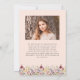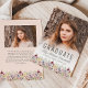 Uma bela borda floral de aquarela de flores silvestres decora a borda inferior deste cartão de anúncio de graduação de bolho de tendência. Na frente da placa, personalize a cobertura de texto da cinza de carvão em uma foto vertical do formando, com o nome do formando em script de escrita manual e o ano escolar e de aula em fonte sans serif. A parte de trás repete a borda da flor silvestre sobre um fundo cor-de-rosa esbranquiçado e apresenta uma segunda foto horizontal, com espaço para detalhes sobre as conquistas do seu formando e planos futuros. Uma boa escolha para segundo grau ou formandos.