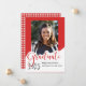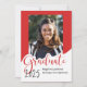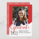 Este anúncio de graduação de fotos reluzente apresenta a palavra "formando" em letras grandes vermelhas com um lugar para sua foto favorita. A parte de trás é uma design de bolinhas branca e preta.