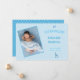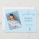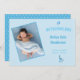 Cartão Azul de Anúncio de Bebê de Nova Data de Nascimento do Menino. A design de cartão tem uma foto que você substitui por sua própria, mais uma girafa fofa, o nome do bebê, a data de nascimento e os estáticos vitais. O fundo é azul com pontos brancos.