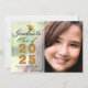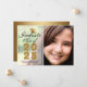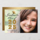Anuncie sua formatura em estilo com este elegante cartão de anúncio personalizado de fotos. Este design tem sua foto à direita e à esquerda é uma camada com um design de tipografia com as palavras Classe de Formando de 2025 com seu nome e escola para personalizar em ouro e roteiro preto, acentuado por um falso boné de formando de ouro. A parte de trás da placa é uma textura falsa de ouro. Desenhada por Susan Coffey.