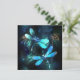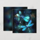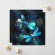 Duas libélulas transparentes, luminosas, turquesas, desenhadas artisticamente sobre fundo noturno, com algas e vagalumes luminescentes do lago. Dragonfly brilhante.