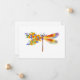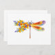 Pintura artificial, libélula floral em laranja e roxo contrastantes com papoila amarela, brilhante e florescente da Califórnia e flores silvestres azuis em fundo branco.