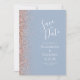 A borda esquerda deste elegante casamento moderno salve o cartão de data apresenta um rosa dourado falso borda brilhante. O texto personalizável combina manuscrito branco, fontes em copperplate e itálico em um fundo azul empoeirado. O verso apresenta um design azul empoeirado e rosa dourado correspondente.