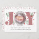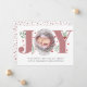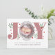 Dusty rosa cor-de-rosa Joy com bagas Primeira Foto de Natal Anúncio de nascimento de menina Feriada. Mostra a palavra "JOY" com bagas vermelhas e verde enquanto em vez da letra "O" está a sua foto. O dorso inclui bolinhas de rosa poeirentas.
