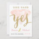 Convite 5x7 semi-brilho na frente, parte de trás fosca. A frente tem um diamante rosa com letras douradas cintilantes que dizem, "Ela disse Sim".
