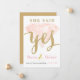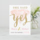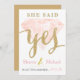 5 horas por dia, 7 dias por semana, para frente, para o convite final. A frente tem um diamante cor-de-rosa com letras brilhantes douradas que diz, "Ela disse sim".