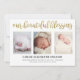 Cartão de nascimento elegante e simples com texto brilhante dourado que diz, "Nossa Bênção Bela" em letra de escrita manual e estilo caligrafia. Com 3 cartões de anúncio de colagem de fotos. Funciona melhor com fotos de orientação vertical ou de orientação vertical. Substitua as fotos por sua própria foto recém-nascida para personalizar este cartão.