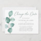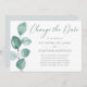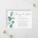 Quando sua data de casamento for adiada, esta elegante mão pintada com aquarela eucalipto Mudar o Cartão de Data informará seus amigos e famílias em estilo. Este design moderno apresenta uma simples marca de aquarela eucalipto à esquerda com seus detalhes à direita para você personalizar. Desenhado pela artista ©Susan Coffey.
