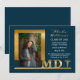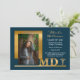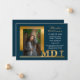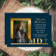 Classe e elegante anúncio de formatura de médico com um texto "MD" dourado e caduceu, design de Holiday Hearts Designs (direitos reservados). Modelo de anúncio com foto cortesia Unsplash.