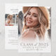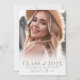 Um simples e elegante anúncio de formatura inspirado em boho com uma estética leve e brilhante. A frente apresenta uma foto de página inteira com um gradiente branco suave na parte inferior, emoldurando lindamente o texto. "Turma de 2026" aparece em fontes clássicas bege ou taupe, seguido pelo nome do graduado e da escola em letra cursiva elegante para um toque atemporal.