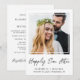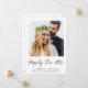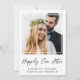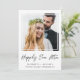 Elegante anúncio de fuga ou casamento menor e convite de recepção ou festa de celebração pós-casamento. A frente apresenta sua foto em uma moldura quadrada recortada, "feliz para sempre" escrito em uma fonte moderna, e seus primeiros nomes, data e local do casamento em tipografia simples. No verso, você pode personalizar o anúncio do seu casamento com mais detalhes, adicionar um convite de recepção ou festa e assinar seus nomes de casados em uma fonte com estilo de assinatura.