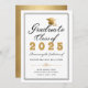 Anuncie sua graduação com estilo com este cartão de anúncio personalizado elegante. Este design de tipografia apresenta as palavras Graduado Turma de 2025 com seu nome, escola e data para personalizar em ouro e branco acentuado por um boné de graduado em ouro falso e emoldurado em preto. O verso do cartão é branco. Desenhado por Susan Coffey.