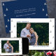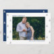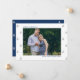 Carregue sua foto neste cartão de anúncio de gravidez de férias limpo e minimalista. O modelo de foto está configurado para que você adicione sua foto à frente, em formato paisagem, assim como sua mensagem no verso. O texto da frente é perfeitamente editável e, atualmente, lê-se "feliz natal da nossa família de três", que em breve será. Você pode, é claro, personalizá-lo para Felizes Feriados e família de cinco, por exemplo, ou quaisquer ajustados que você precise. A design tem simples pincel de árvores de natal esboçadas e uma paleta de cores moderna de azul-da-noite, cinzas e branco.