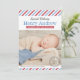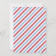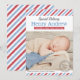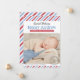 Cartão de anúncio de nascimento com foto inspirada em vintage apresenta um cabeçalho de texto "Entrega Especial" com o nome do bebê em negrito tipo serif, estatísticas de nascimento em uma faixa de fita vermelha e um carimbo postal "Nosso Menino Chegou". Listras diagonais clássicas vermelhas, brancas e azuis desgastadas enquadram o design com uma mensagem "Recebido com Amor" abaixo. A parte de trás continua o padrão de listras de correio aéreo. Todo o texto e cores são totalmente personalizáveis.