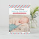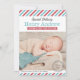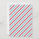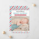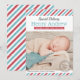 Cartão de anúncio de nascimento com foto inspirada em vintage mostra um cabeçalho de texto "Entrega Especial" com o nome do bebê em negrito serifado, estatísticas de nascimento em uma faixa de fita vermelha e um carimbo de "Nosso Bebê Menino Chegou". Listras diagonais vermelhas, brancas e aqua turquesa clássicas enquadram o design com uma mensagem "Recebido com Amor" abaixo. A parte traseira continua o padrão de listras de correio aéreo. Todo o texto e cores são totalmente personalizáveis.