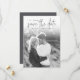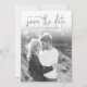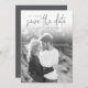 Um moderno e na moda, salve a data design com uma cobertura de texto de cinza e uma foto vertical ou vertical de sangria de cheio. "Salvar a data" aparece no topo da tipografia de script esboçada à mão, com seus nomes, data de casamento e local encaixado no design. Adicione detalhes adicionais, como o site do seu casamento, ao verso.