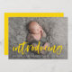 Cartão de anúncio de nascimento de foto moderno com a foto horizontal do recém-nascido do seu bebê com "apresentação" em uma camada amarela de script de pincel. Personalize a frente dos simples anúncios de nascimento com o nome do bebê e as estatísticas de nascimento. A placa reverte para exibir um fundo amarelo sólido com espaço para fotos e texto adicionais.