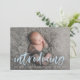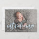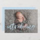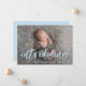 Cartão de anúncio de nascimento de foto moderno com a foto horizontal do recém-nascido do seu bebê com "apresentação" em uma camada azul-clara de script de pincel. Personalize a frente dos simples anúncios de nascimento com o nome do bebê e as estatísticas de nascimento. A placa reverte para exibir um fundo azul-céu sólido com espaço para fotos e texto adicionais.