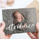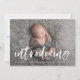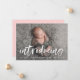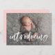 Cartão de anúncio de nascimento de foto moderno com a foto horizontal do recém-nascido do seu bebê com "apresentação" em uma camada branca de script de pincel. Personalize a frente dos simples anúncios de nascimento com o nome do bebê e as estatísticas de nascimento. A placa se reverte para exibir um padrão geométrico cor-de-rosa.