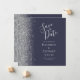 A borda esquerda deste elegante casamento moderno salve o cartão de data apresenta uma borda cintilante. O texto personalizável combina a escrita manual de cinzas prateadas, fontes copperplate e itálico em um fundo azul escuro. O verso apresenta um design azul e prateado correspondentes.