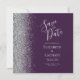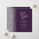 A borda esquerda deste elegante casamento moderno salve o cartão de data apresenta uma borda cintilante. O texto personalizável combina a escrita manual de cinzas prateadas, fontes copperplate e itálico em um fundo roxo escuro. O verso apresenta um design púrpura e prateado.