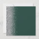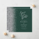 A borda esquerda deste elegante casamento moderno salve o cartão de data apresenta uma borda cintilante. O texto personalizável combina a escrita manual de cinzas prateadas, fontes copperplate e itálico em um fundo verde esmeralda escuro. O verso apresenta um design verde e prateado correspondentes.