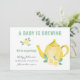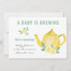 Digamos que estamos esperando! com um cartão de anúncio de fotogravidez. Um Bebê está Brewing está escrito na tipografia da manchete com a mensagem de data de vencimento do seu bebê em um script casual de estilo manuscrito. O modelo de fotografia está configurado para que você adicione uma imagem de perda de cheio no verso, juntamente com seu sinal de desligamento e nomes. Este design neutro de gênero apresenta um bule de aquarela fofo e flores amarelas.