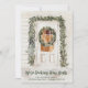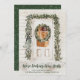 Anúncio comovente de feriado elegante com porta de frente de neve com uma coroa festiva e terra firme. "We'are Decking New Halls" é exibido em um script verde ousado com seu nome e endereço exibidos abaixo. A parte de trás do anúncio comovente do Natal apresenta um fundo verde com nevões brancas.