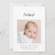 Cartão-modelo de anúncio de nascimento simples e bonito com um texto no topo que diz "Estou aqui!" com pontos falsos de brilho dourado. Você pode adicionar um total de 4 fotos do seu bebê recém-nascido na frente e atrás deste cartão. Adicione as estatísticas do bebê no fundo.