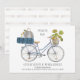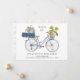 Cartão de anúncio de mudança engraçado com ilustração de aquarela de uma bicicleta carregada de bagagem e plantas de casa. O design é escrito com tipografia de letra fina e caprichosa e é totalmente editável. A redação da amostra diz "Estou a caminho .. me encontre no meu novo endereço!" que você pode manter ou editar como desejar, bem como adicionar seu(s) nome(s) e novo endereço.