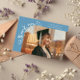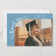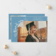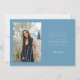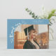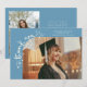 Anúncio de formatura excêntrico e caprichoso cartão de foto com uma foto na frente e 1 no verso. O texto diz "obrigado" em escrita à mão excêntrica com estrelas e confetes. Adicione o nome do graduado, informações e mensagem para personalizar este cartão. Azul jeans.