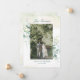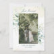Elegante anúncio botânico / Elopement apresentando sua foto favorita emoldurada com folhas de eucalipto e verde com uma dica de azul e manchas de brilho de ouro falso sobre uma lavagem a aquarela pastel. Acima está "Recem casados" na escrita e abaixo estão os seus nomes e a data do casamento. O verso tem sua mensagem pessoal. Uma design simples e rústica que é excelente para o casamento de verão.