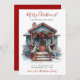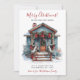 Esta rústica aquarela Feliz Natal nova casa para o cartão de anúncio de feriados com uma porta de madeira festivamente decorada com arbustos e árvores de pinheiro, uma coroa, e arcos de feriado vermelhos seria perfeito para enviar para seus amigos e família agora que você se mudou para uma nova casa. O sentimento é personalizável. Basta para que todos que conheces e amamos tenham o teu novo endereço. Ficarão tão animados com a sua grande jogada!