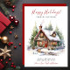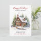 Esta rusticada coloração aquática Feliz Feriados nova casa para o cartão de anúncio de feriados com uma cabana de madeira festivamente decorada com arbustos de pínus e árvores seria perfeito para enviar para seus amigos e família agora que você se mudou para uma nova casa. O sentimento é personalizável. Basta para que todos que conheces e amamos tenham o teu novo endereço. Ficarão tão animados com a sua grande jogada!
