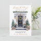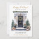 Esta aquarela Feliz Feriados é nova casa para o cartão de anúncio de feriados com uma porta da frente festivamente decorada com arbustos e árvores de pinheiro, uma coroa, e os presentes seriam perfeitos para enviar aos seus amigos e família agora que você se mudou para uma nova casa. O sentimento é personalizável. Basta para que todos que conheces e amamos tenham o teu novo endereço. Ficarão tão animados com a sua grande jogada!