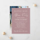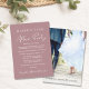Fuga romântica de casamento em rosa empoeirado chique ou anúncio de casamento privado combinado com um convite para recepção de casamento ou festa de celebração. A frente apresenta "Festa Feliz para Sempre" em uma mistura de tipografia branca simples e uma escrita moderna branca, e você pode personalizar sua mensagem e convite com mais detalhes e adicionar seus nomes em uma escrita semelhante a uma assinatura. O verso apresenta sua foto de casamento favorita, seus primeiros nomes e data do casamento.
