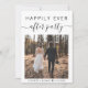 Anúncio de casamento ou elopamento moderno minimalista e convite para recepção de casamento menor. A frente apresenta a foto do dia do seu casamento e "Festa Feliz para Sempre" em uma mistura de tipografia simples e escrita moderna com floreios. Abaixo da sua foto, adicione seus primeiros nomes e data do casamento. No verso, personalize seu anúncio de casamento e convite para a recepção com mais detalhes, insira o endereço do site do seu casamento para criar um código QR para que os convidados o leiam e vejam as fotos do seu casamento, todos os detalhes e respondam online, e adicione seus nomes em uma escrita semelhante a uma assinatura.