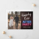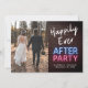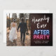 Anúncio de casamento moderno e despojado ou convite de casamento menor e convite de recepção para informar familiares e amigos de que você se casou em uma pequena cerimônia de casamento íntima, e para convidá-los para uma recepção de casamento ou festa. A frente apresenta sua foto do dia do casamento e "Festa Feliz para Sempre" em uma mistura de letras brancas e tipografia vermelha e azul com um efeito de luzes de néon brilhantes contra um fundo de parede de tijolos. No verso, você pode personalizar sua mensagem com mais detalhes e seus nomes em uma escrita semelhante a uma assinatura.