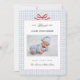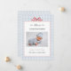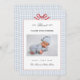Um charmoso cartão de anúncio de nascimento de gingham, azul e branco, apresenta um doce arco vermelho amarrado no topo, acrescentando um toque de elegância. Perfeito por receber um bebê. O padrão gingham adiciona um toque divertido e clássico, fazer este cartão adorável e eterno.