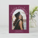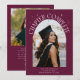 Cartão de foto de anúncio de formatura moderno e caprichoso com uma foto emoldurada arqueada na frente e 1 no verso. O texto diz "Capítulo Completo" com estrelas desenhadas à mão. Adicione o nome do graduado, informações e mensagem para personalizar este cartão. Fundo de cranberry.